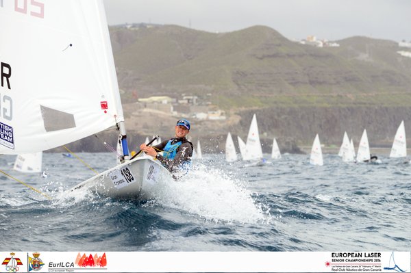 Nick Thompson leads the Laser Standard class in the European Senior Championship that kicked off this Monday in Gran Canaria. Three poles in the first three races gives the current World Champion the leading position in a demanding day with hard wind and wave conditions.