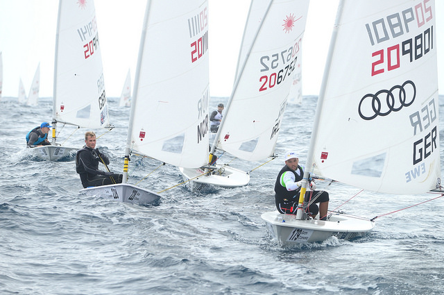 In Laser Standard the current world champion (Nick Thompson) holds the lead, although a disqualifying start helped both the Argentinian Julio Alsogaray and the German Philipp Buhl to come a bit closer. Alsogaray and Buhl are tied with 14 points, only two points under the leader.